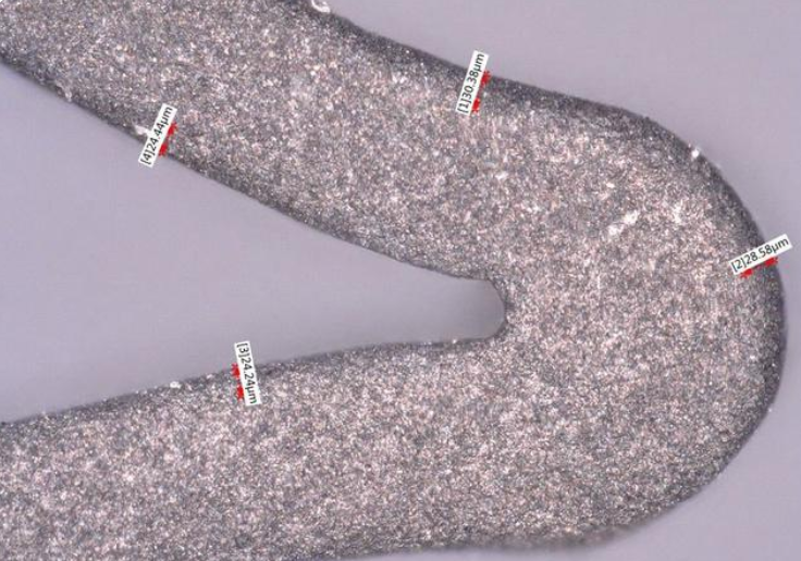 - 最近的支架设计和医疗植入物要求更大的边缘倒圆角。圆形边缘降低了被植入物卡住,其他风险的可能性。氧化铝微喷丸的半径为5-15 m,但新的几何尺寸指定为接近25 m。该半径可以通过三种途径实现:延长喷砂周期,使用更大尺寸的氧化铝或完全使用其他磨料。